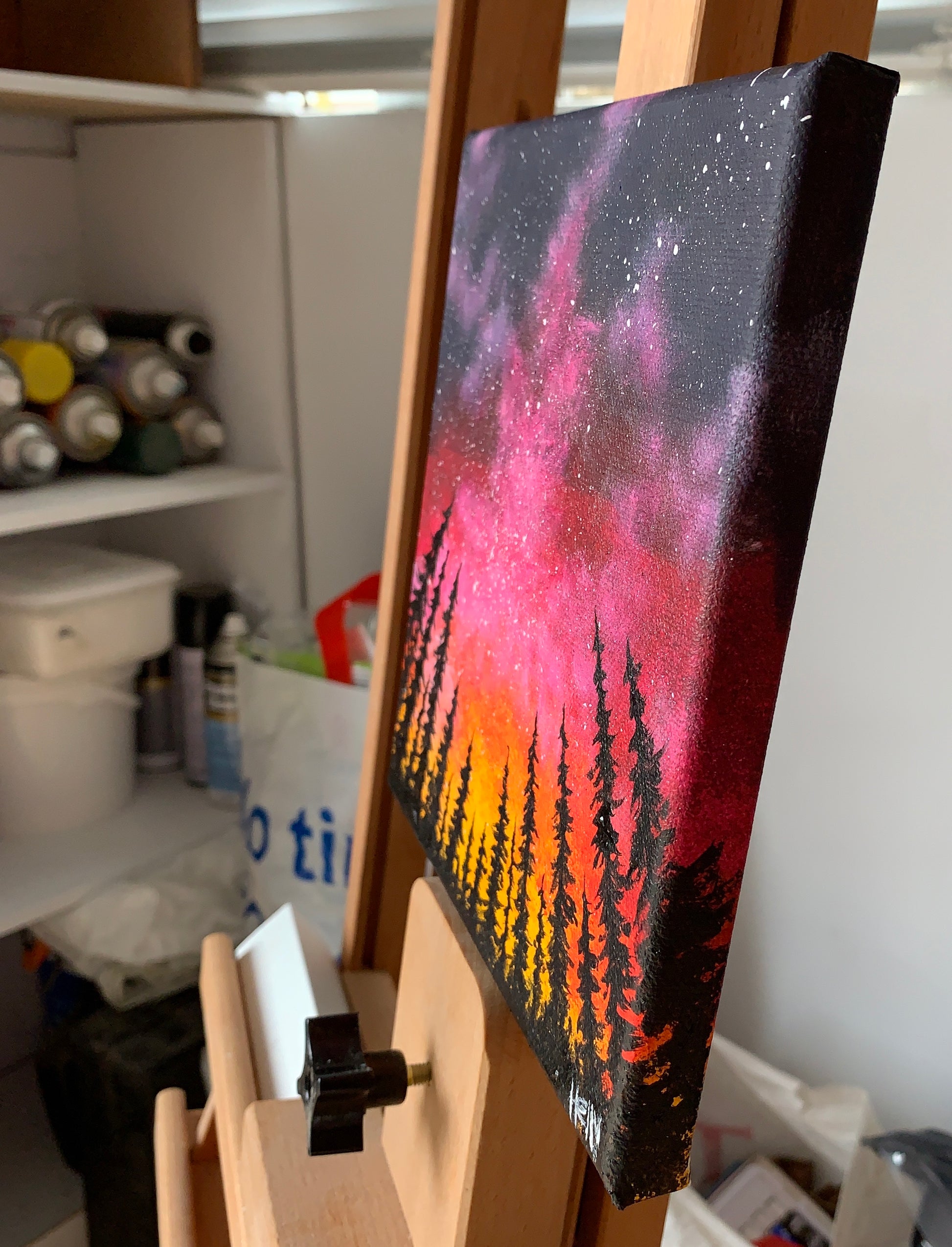This colourful original painting was created using acrylic paints on a 20x20cm slimline cotton canvas.It depicts a glowing sunset shining through the trees and is sure to bring a small but perfectly formed burst of colour to your wall.