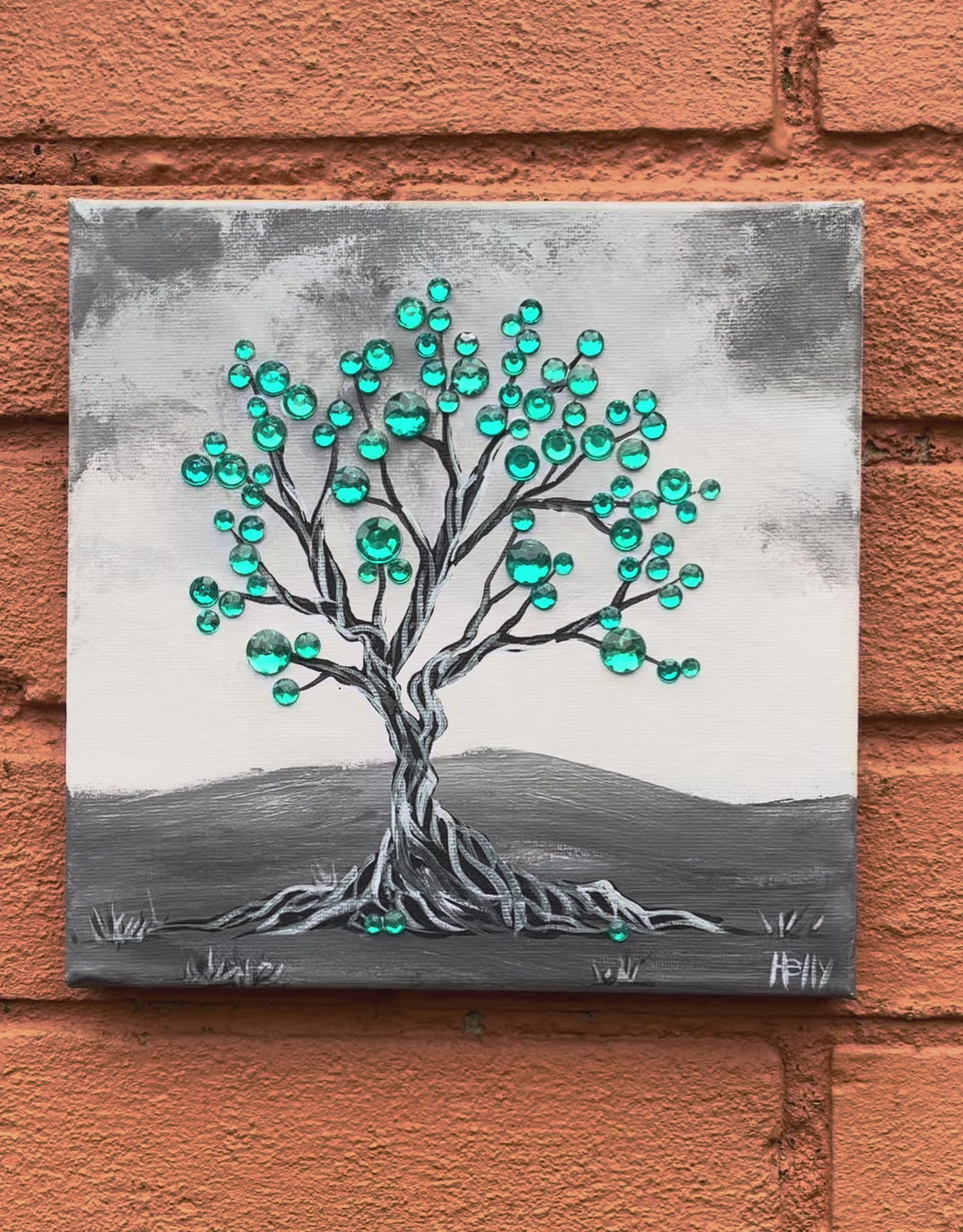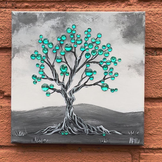 this stunning little painting was created using acrylic paints on a 20x20cm canvas it was inspired by my love of bonsai trees which i find intriguing the way the roots can wrap around anything and keep the tree strong.