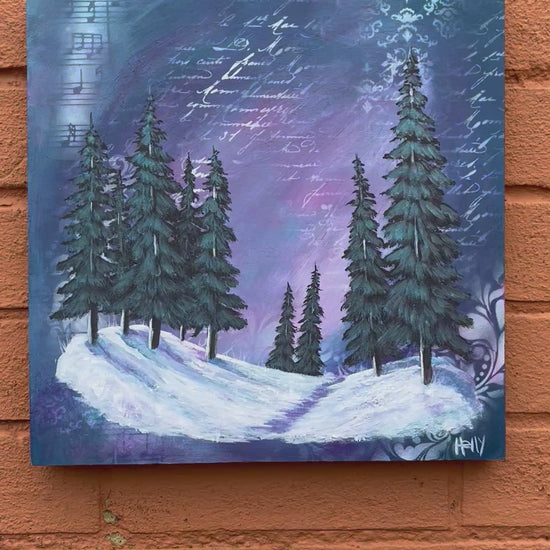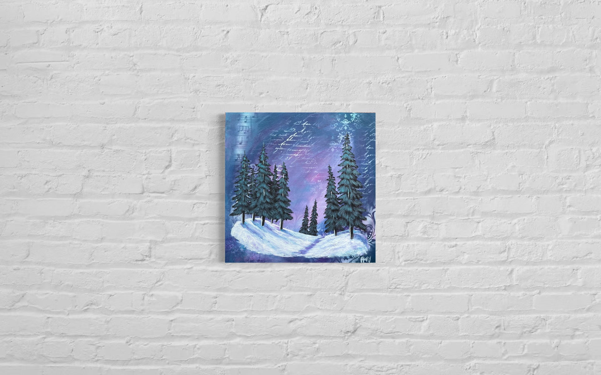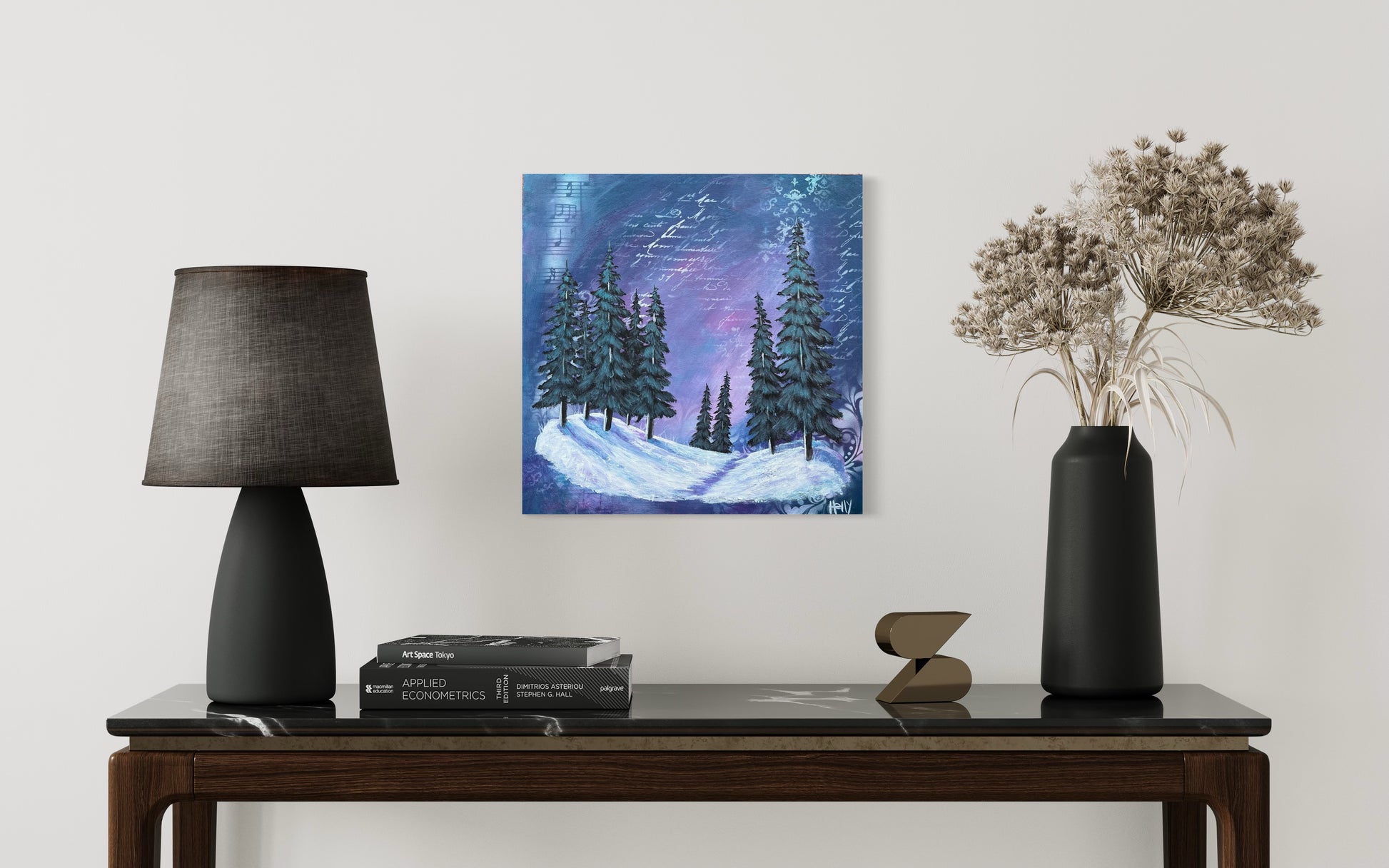 Discover the serene beauty of "Winter's Lullaby" with this Alaskan painting. The sensory experience of its delicate trees and rich colors will transport you to a tranquil winter wonderland. Expertly crafted, this piece is a must-have for any art enthusiast looking to add a touch of nature to their decor.